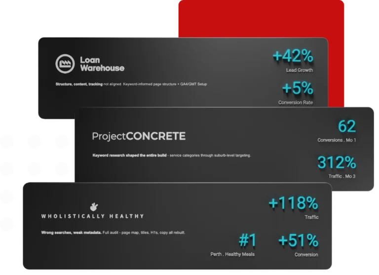 For Loan Warehouse, Perth Digital Edge handled content creation, web design direction, SEO foundations, and tracking setup. Once the structure and measurement were cleaned up, the site recorded a 42 percent increase in leads and a 5 percent lift in conversion rate. The important part was not just the uplift. It was why it happened. Better page structure, stronger alignment between content and user intent, and clearer visibility into how users moved through the site.